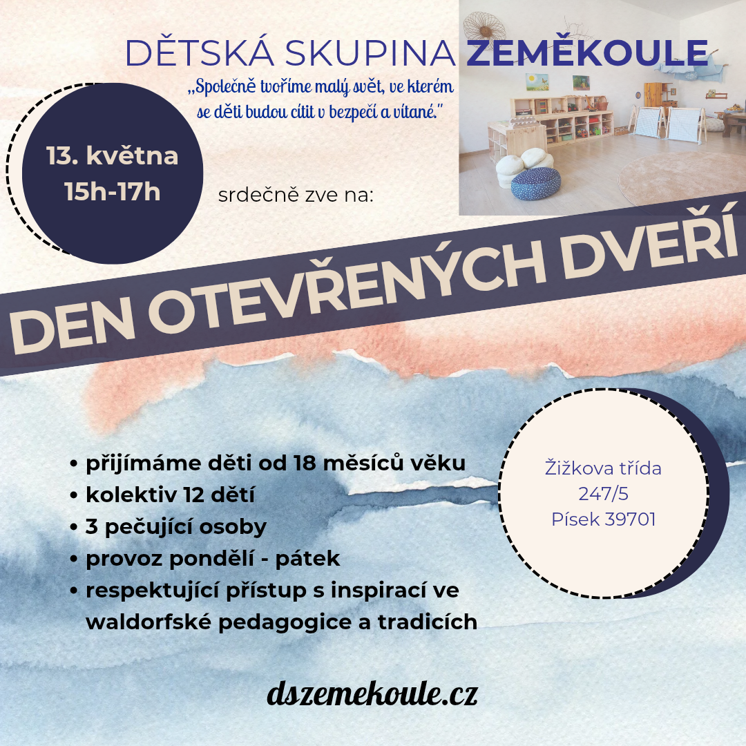 Srdečně zveme všechny zájemce o zápis do dětské skupiny Zeměkoule na Den otevřených dveří. Těšíme se na Vás: