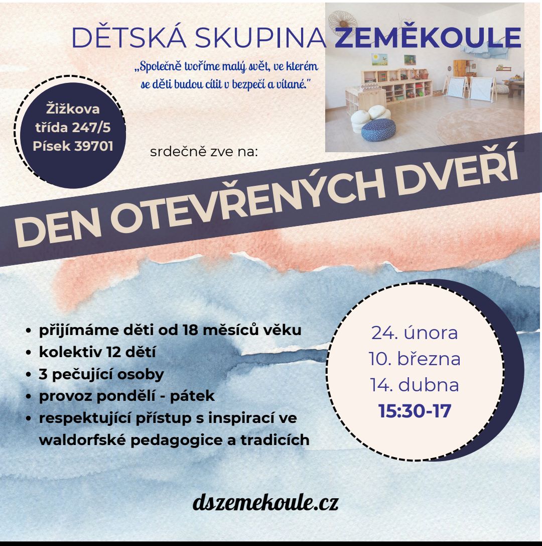 Přijďte se za námi podívat na Den otevřených dveří ve třech termínech 24.2., 10.3., 14.4. vždy v čase od 15:30 do 17. Můžete se seznámit s prostředím, pečujícími osobami, naším výchovným a vzdělávacím plánem, vyzkoušet si různé typy aktivit a zeptat se na cokoliv, co vás zajímá. Není potřeba se předem registrovat. Těšíme se na vás!